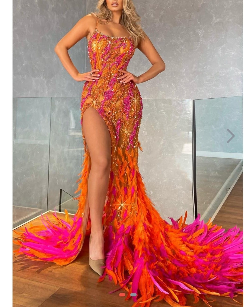 Spaghetti Straps Feather Evening Gown- featuring spaghetti straps, fitted waist, asymmetrical cut, and a floor-length feather train.